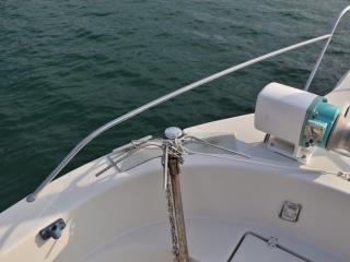 ◆フロントデッキのバウレール、トランサムのステップもしっかりしていました。なお、この艇はバウスプリット形状になっており、バウには電動アンカーウィンチが装備されています。