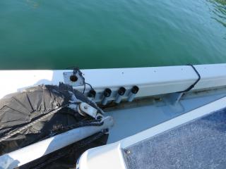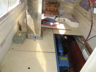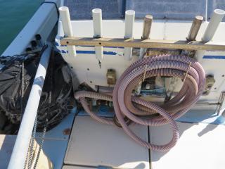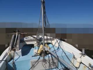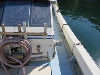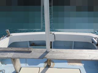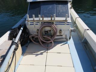 ◆バウデッキにアンカーのコロ台があります、アンカーローラーはベルト式です、ロープ巻きのタイコはキャビン左舷の前方にあります。
