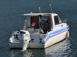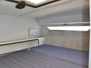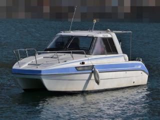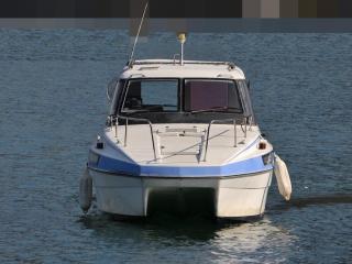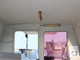 ◆艇は平成4年進水のサンキャット7.7「サルーン」と呼ばれる艇で、型式は「SC770TCR」です。取材時の船齢は約29歳ですので、船体は船齢なりの経年劣化が見受けられますが、航行に影響があるような大きな損傷は無い様に見受けられました。また、船底はサンキャットの特徴であるカタマラン(双胴)です。カタマランは一般的に横揺れが少ないと言われていますが、船幅も約2.5mあるという事もあり、同クラスの艇と比較すると静止時の横揺れも小さい艇だと思われます。