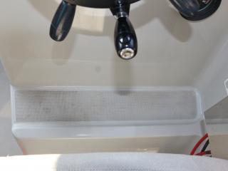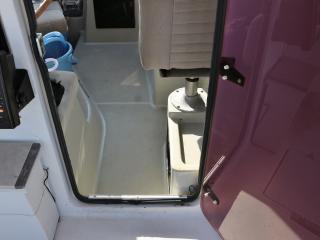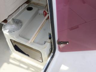 ◆アフトデッキ右舷側にはアフトステーションがあります。このアフトステーションのリモコンレバーにはうかつに触ってしまわないようにステンレスのカバーが装着できます。また、左舷側には葵ソニック製の10.4型カラー液晶魚探SF-100が備わっています。なお、ギャレーやシャワーも付いていますが、現在は使われていません。推測ですがモーターが故障していると思います。