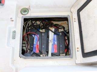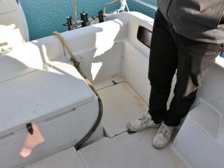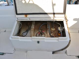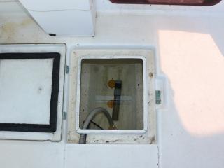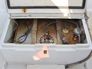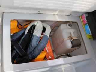 ◆トランサム側右舷にはバッテリーストレージとメインスイッチがあります。バッテリーは2020年6月に2個共に交換されています。左舷側はストレージ(物入)として使えます。また、トランサム側中央に燃料タンクがありますが、容量はおそらく180L程度ではないかとの事です。