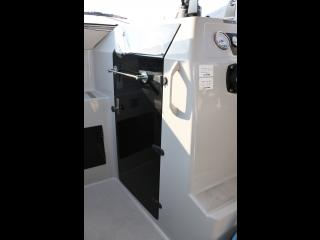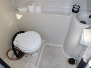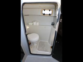 ◆コクピットからは全周に渡って見切りが良く操船はし易そうです。ベッドスペースには操船部左側から入れます。この艇はここも広いので色々な使い方が楽しめると思います。ベッドルーム入口の右に個室トイレがあります。なお、トイレは電動で、取材時には動作確認をさせていただきました。