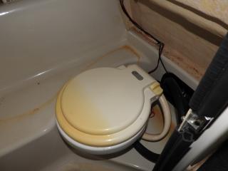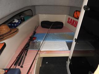 ◆バウバースは広く2人は休息できるスペースです、右舷側に個室の手動式トイレが有ります。