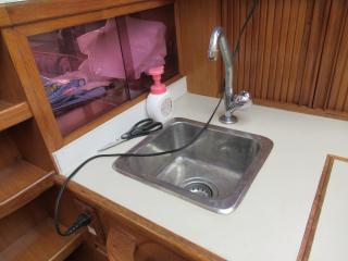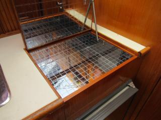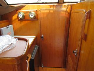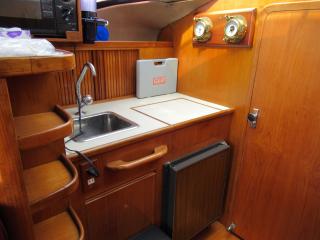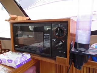 入口を入るとまずメインキャビンになっています。大きなソファーやテーブルがあり、ゆったりとくつろげる空間になっています。そのまま前方に進むと左舷側はギャレーになっています。ギャレーにはシンク、冷蔵庫、電子レンジ等の装備があります。