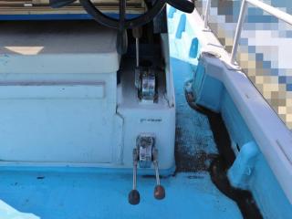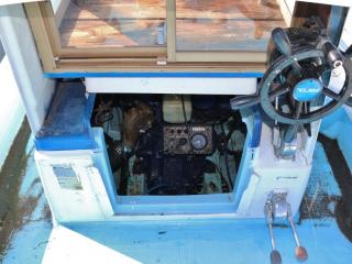 ◆中央のブリッジには魚探などを入れるスペースがあり、その下がエンジンルームになっています。ブリッジ右側には太めのパイプでできたサイドレールが備わっており、しっかり取りつけられていました。ブリッジ右舷側に油圧の舵ハンドルがあり、その下にエンジンリモコンレバーが付いています。レバーが3本ありますので、一本は微速レバーだと思われます。