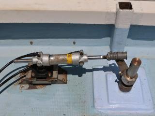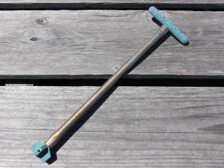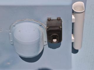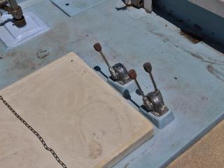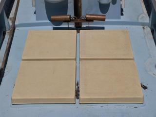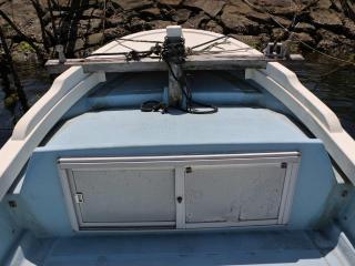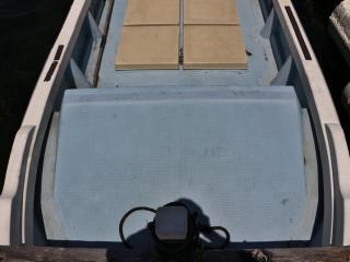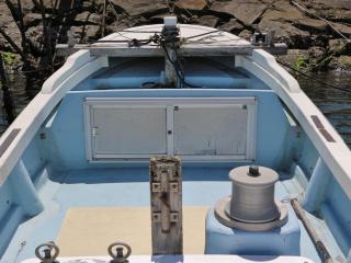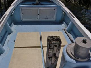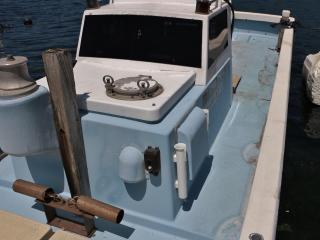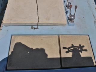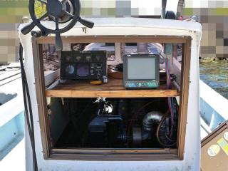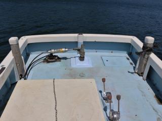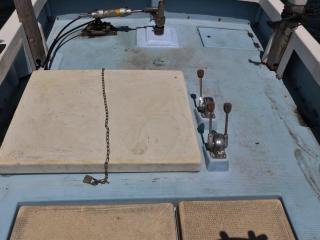 ◆操船部は左舷寄りにヘルムハンドルがあり、右舷側にエンジンリモコン、微速レバーはアフトデッキ(トモ)の上にレイアウトされています。この艇はトモの右舷側サブタを開けてそこに座って操船できるような仕様になっています。その為にデッキにエンジンリモコンや微速レバーが付いています。なお、写真には写っていませんが、舵シャフトに操作棒を付けるアダプターも付属していますので手舵操船も可能です。