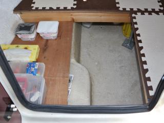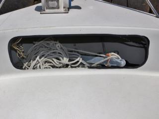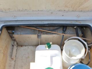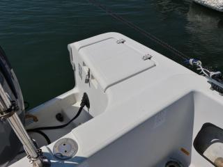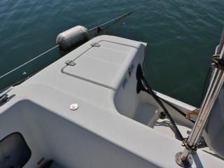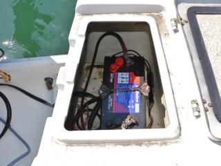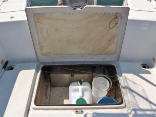 ◆トランサム側左舷にはバッテリーストレージとメインスイッチがあります。バッテリーは2019年11月に交換されています。右舷側はストレージ(物入)として使えます。また、トランサム側中央に燃料タンクがありますが、容量はおそらく120L程度ではないかとの事です。
