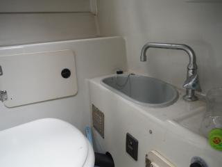 ◆リアドアの前、左舷側に流し台があります、調理などもできるようです。
