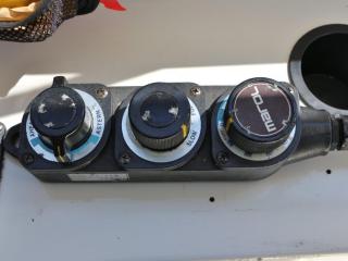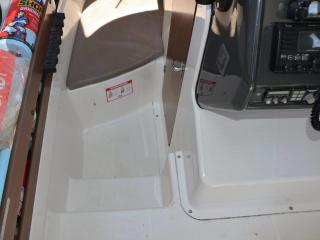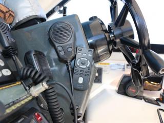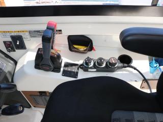 ◆ブリッジ後部左舷側に3連リモコンを持ってくればセカンドステーションになり、アフトデッキでも操船可能です。また、微速装置のレバーもここにあります。