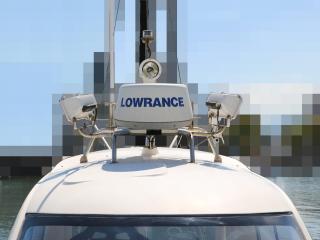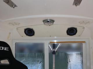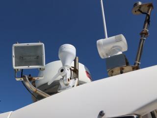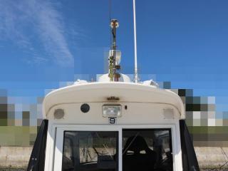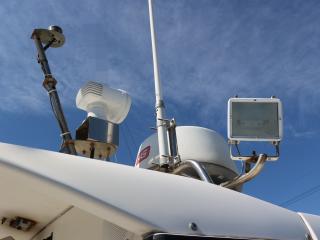 ◆ルーフには各種アンテナとサーチライト、集魚灯が艤装されており、夜釣りも楽しめそうです。なお集魚灯の電源は主機前の2kw発電機より供給されています。