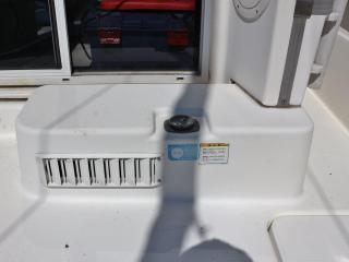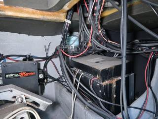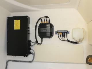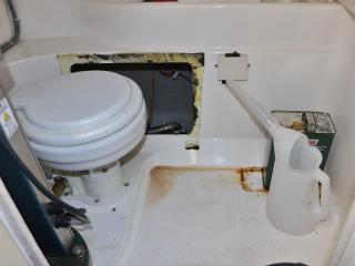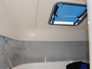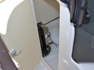 ◆操船部の左舷側から階段より下階層のキャビンスペースにアクセスできます。ここには個室トイレ(電動式)も備わっています。トイレ内にはソナーのユニットやDC-ACインバーターも備わっています。