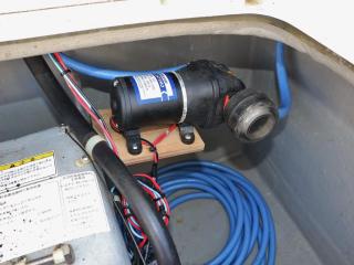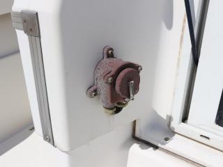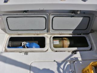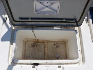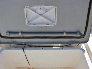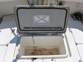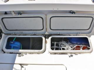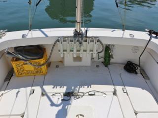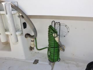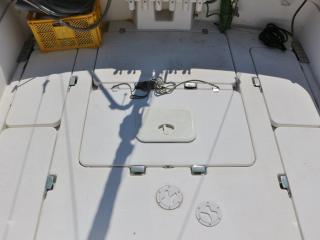 ◆アフトデッキのトランサム側には海水デッキウォツシュと清水のシャワーも備わっています。また、イケスはアフトデッキ中央にあり、イケスのサブタ裏の穴あきパイプに海水デッキウォッシュのホースを差し込めば、イケス内の魚が酸欠になりにくいようにバシャバシャと水が出るようになっています。