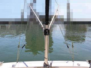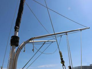 ◆ヤマハ製スパンカーのフレームも外観は良好でした。スパンカーの生地も広げて確認はしていませんが、比較的最近、浦田帆屋さんの丈夫な生地の物に交換されていますので良好との事です。