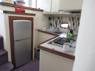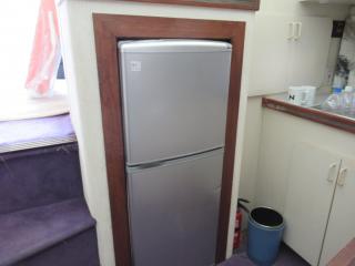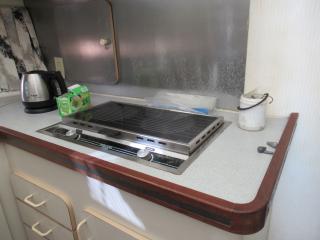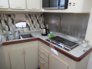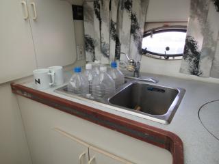 センターキャビンを進んで階段を降りたところには、ギャレーがあります。ギャレーにはシンクや冷蔵庫、電子レンジ、電気コンロなどが装備されています。
