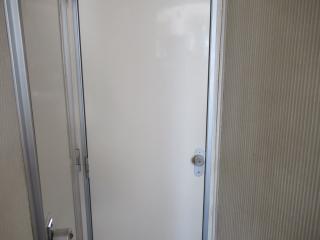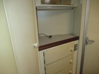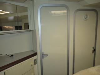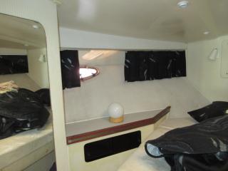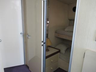 階段を降りて右舷側にはゲストルームがあります。ゲストルームには2段ベッドの装備があります。左舷側にはトイレとシャワールームがあります。