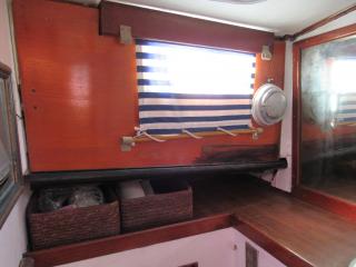 まず入口を入るとまずセンターキャビンになります。中央にはテーブルが装備されており、両舷にソファーがあります。右舷側ソファーの前方がLSの操船席になります。センターキャビンにはエアコンやステレオなどの装備があります。