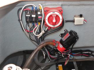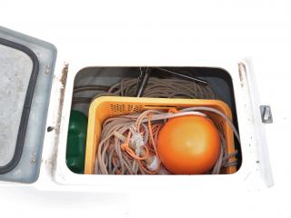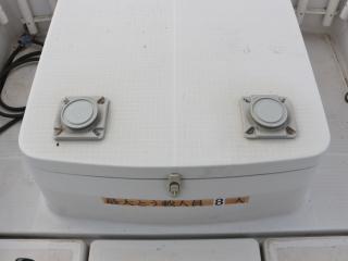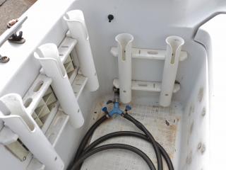 ◆電動リール電源はフロントデッキ1ヶ所、アフトデッキに2ヶ所に備わっています。また、アフトデッキ右舷側にデッキウォッシャー(海水)吐出口があります。