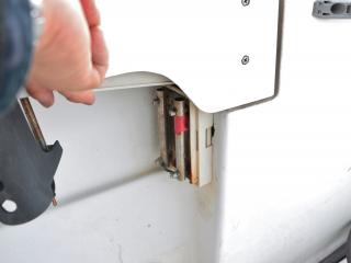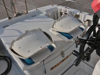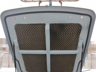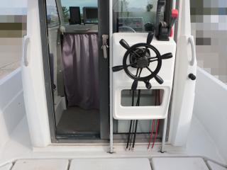 ◆この艇はリアドア付きです。リアドアの右舷側にはセカンドステーションがあり、ここでも操船可能です。微速装置の操作ノブはここについています。