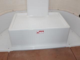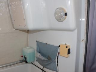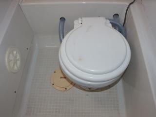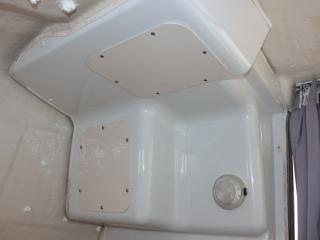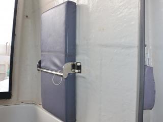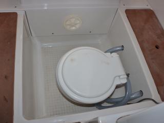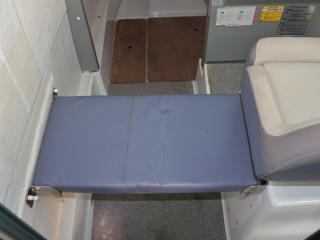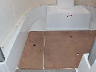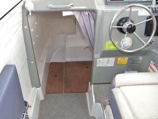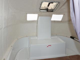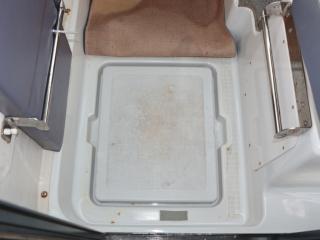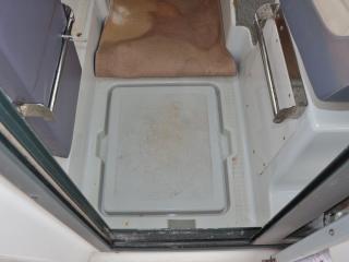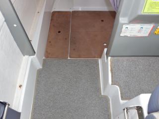 ◆操船部の左舷側からバースに入れます。バースにはパネルが敷いてあり、その下に電動マリントイレが装備されています。