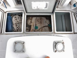 ◆アフトデッキのエンジンハッチ前にはイケスがあります。また、エンジンの両脇に結構大めのストレージがあり、収納力は結構ありそうです。