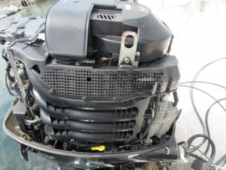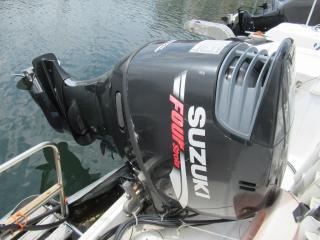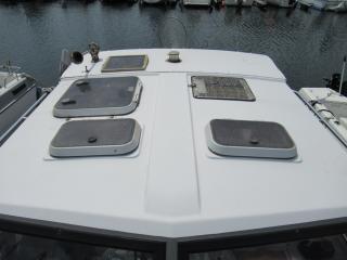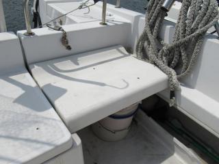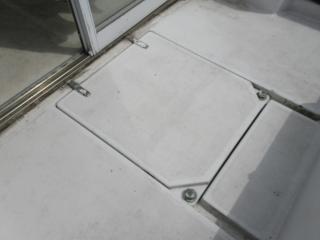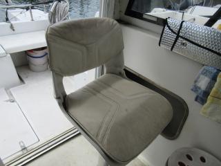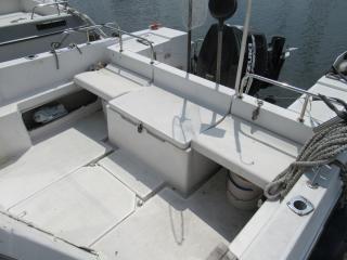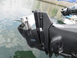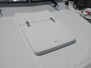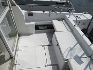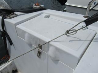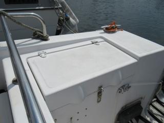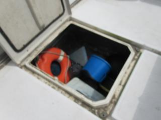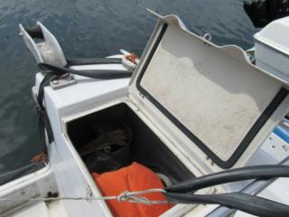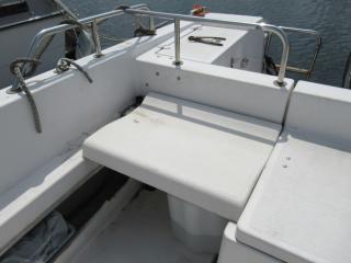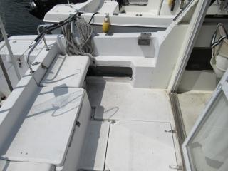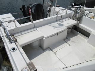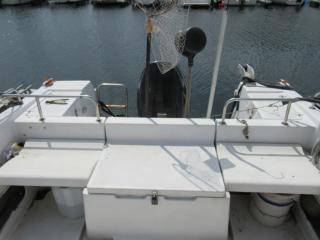 ○デッキはすっきりとした造りになっています。 アフトデッキには、 釣りに便利なイケスや収納スペースの装備があります。 燃料タンクの上側にも座れるスペースがあり、 とても広いデッキなので、とても使い勝手が良い艇だと思います。