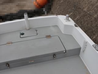 ◆ヘルムハンドルが中央にあり、エンジンリモコンは右にあります。またダッシュボードには魚探を入れられるボックスがついています。なお、魚探は付属していませんが、ホンデックス製の振動子は船底に付けたままとの事です。