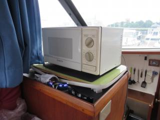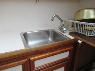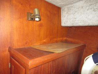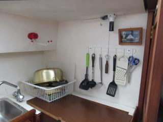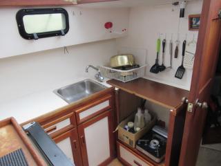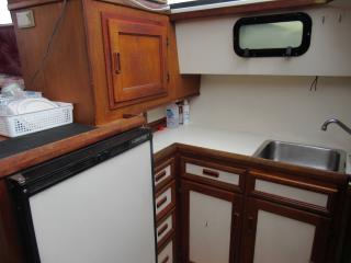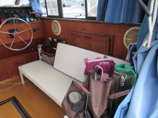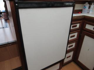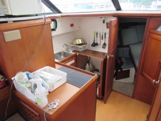 前方がLSの操船席になります。階段下左舷側にはギャレーがあります。ギャレーにはシンク、電子レンジ、冷蔵庫などが装備されています。