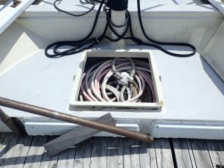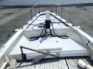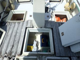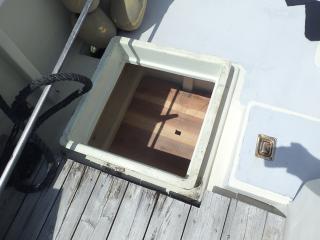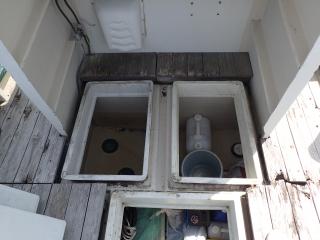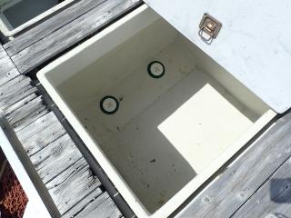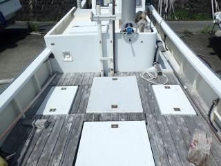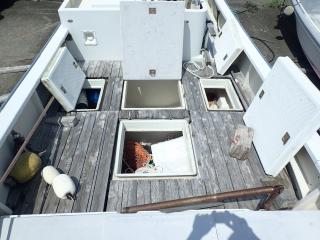 ○おもてのデッキ床下は、物入れと生け簀になっています。またとものデッキも物入れと生け簀の造りとなっており、一か所、プロペラの点検用のハッチとなっていますので、ロープやごみの絡みの確認もしやすいです。