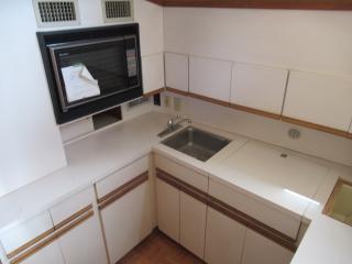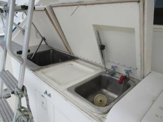 そのまま前方に進んで階段を降りると、右舷側にはギャレーがあります。ギャレーにはシンク、冷