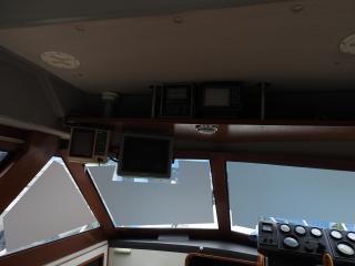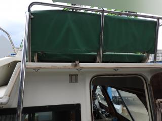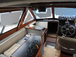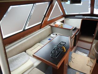 ◆フライブリッジには左舷側から上がります、操舵席は2名座れる広さです、視界も良く操船はしやすそうです。