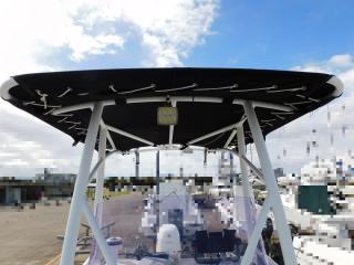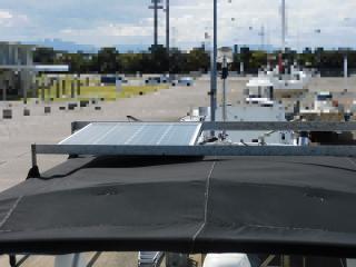 T-トップはスタイリッシュなもので、オーニングテント上面にはソーラーパネルが取り付けてあり、デッキライト(LED) 2灯が前後のデッキを照らしております。