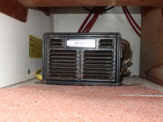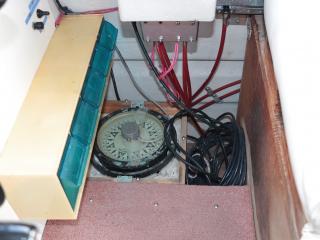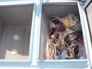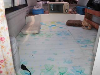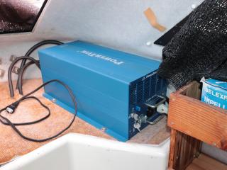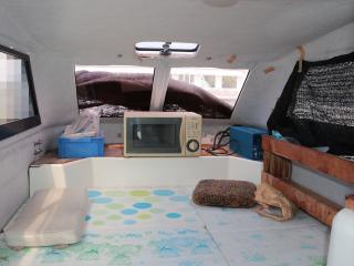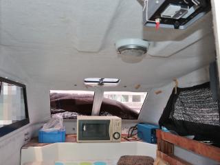 ◆左舷側からキャビンスペースに入れ、大人2人程度が横になれるスペースがあります。ここには電子レンジやインバーターが装備されています。なお、かつてはこの電子レンジがあるところにエアコンの室内機を付けていた事もあったそうです。3kWのインバーターはその際にも使われていたそうです。