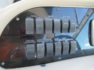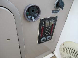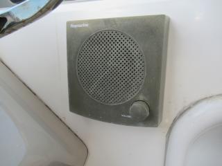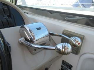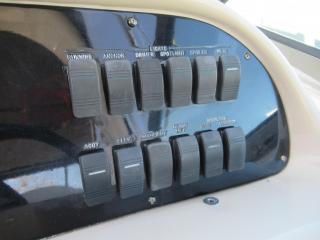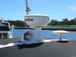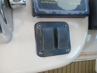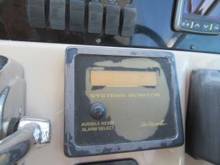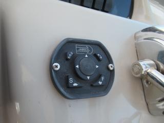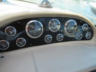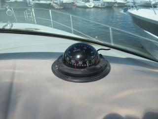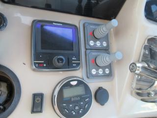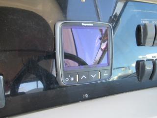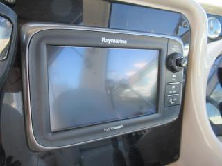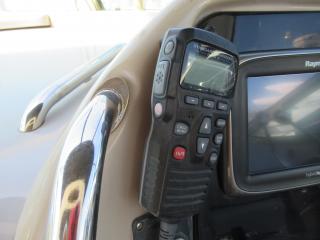 操船席にはコンパス、GPS魚探(Raymarine)、オートパイロット、前後スラスター、トリムタブコントロール、マリンVHF等が装備されています。