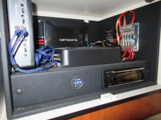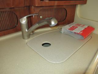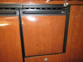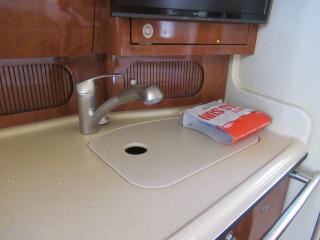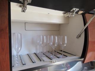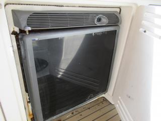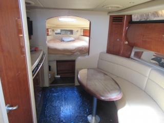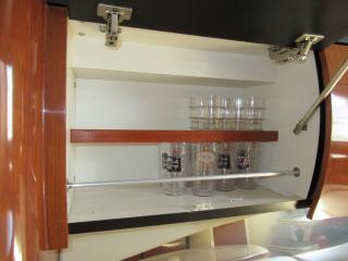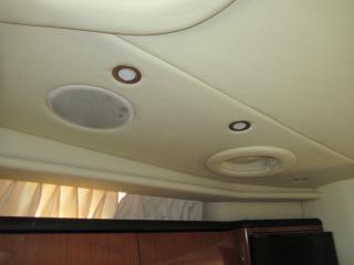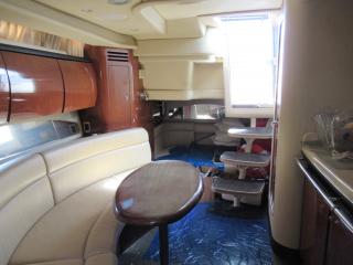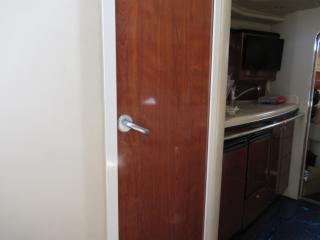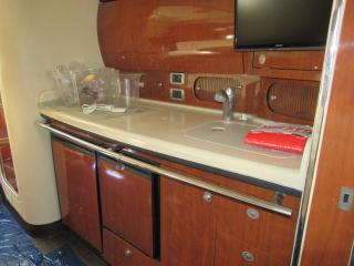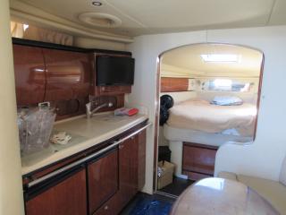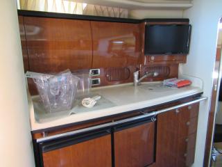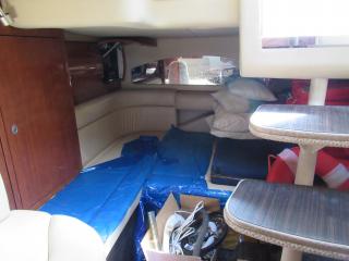 まず入口を入るとまずセンターキャビンになります。右舷側にはテーブルと大きなソファーがあります。また、左舷側にはギャレーとトイレルームがあります。ギャレーにはシンク、電子レンジ、冷蔵庫、TV等の装備があります。