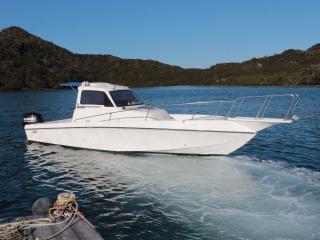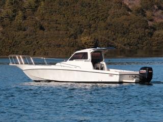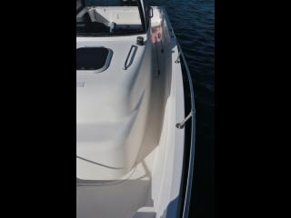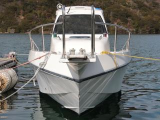 ◆流線形のスタイリッシュでパワーボート的な船体ですが、ウォークアラウンド・デッキで釣りにも使え、快適なキャビンと大人2人が寝られるほどの広さがあるVバースとマリントイレも装備されています。