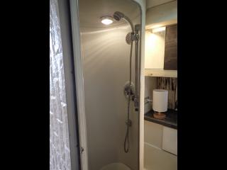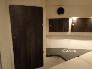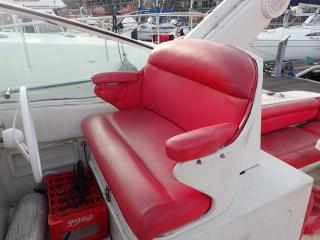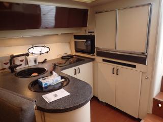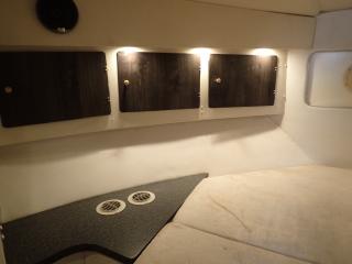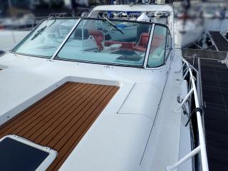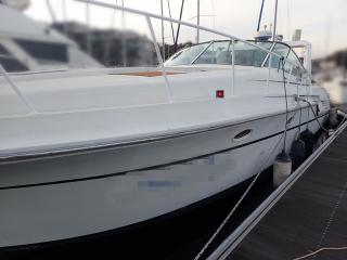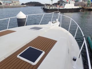 ○船内の造りは船内入りますと左舷側にはソファーの装備があり、右舷側にはギャレーがあります。ギャレーにはシンク、電子レンジ、電気コンロ、大型冷蔵庫等の装備があります。キャビン内にはTV、ステレオなどの装備がありギャレーの前方側にも大きなソファーの装備があります。前方に進むとまずバウルームがあり、大人2人が横になれる十分なスペースが確保されています。トイレルームにはシャワー設備もありますので、来船されたゲストの方々にも喜んで頂ける空間がたっぷりと用意されています。