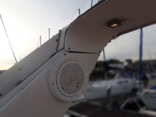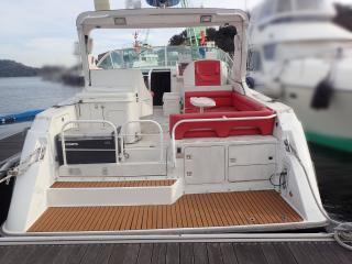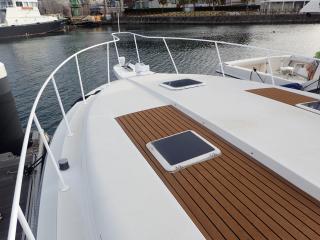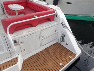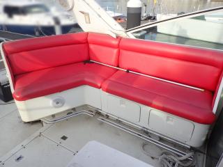 ○アフトデッキはとても広い空間が確保されています。大きなソファーもありますが、一部クッションに剥がれがありました。デッキのレイアウトとしては、船にお招きしたゲストの方々にゆっくりと楽しんで頂ける印象がございました。