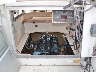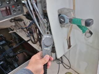 ◆エンジンはヤマハの過給機付き6気筒ディーゼルエンジン、N23(MD580KUH)を1基搭載しています。検査手帳に記載されている連続最大出力は200PS/2850rpmで、最大260PSです。なお、取材時のアワーメーター表示は約354時間でした。この船はワンオーナー船ではありませんので、100%正しいとは言い切れませんが、現オーナーさんが知る限りでは、前オーナーがこのエンジンに載せ替えてこの程度しか乗っていらっしゃらないという可能性が高いとの事でした。
