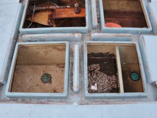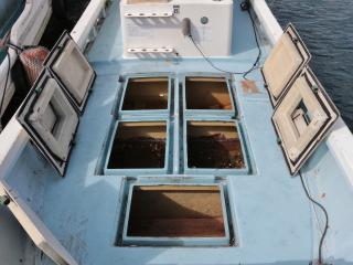 ◆オモテ(フロントデッキ)には4間、トモ(アフトデッキ)には2間のイケスがあります。