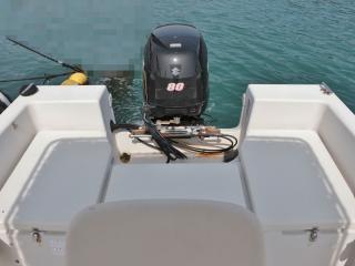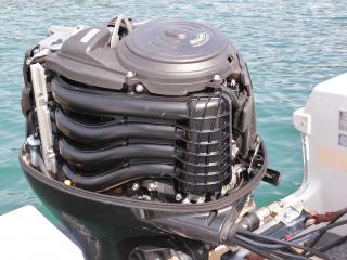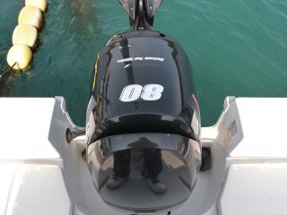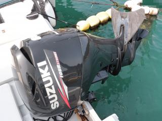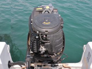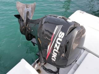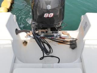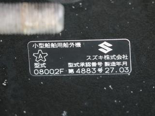 ◆船外機はスズキ製DF80A(型式:08002F 連続最大出力80PS/5500rpm 4サイクル・フューエルインジェクションモデル)が搭載されています。なお、この船外機はコーションプレートの表記によると2015年3月製ではないかと思われます。
