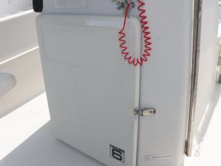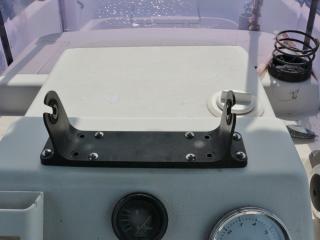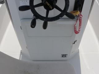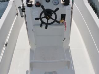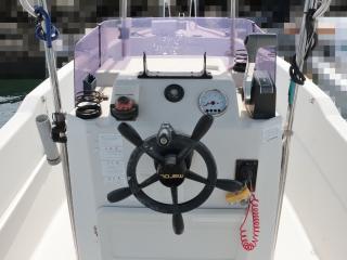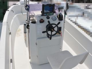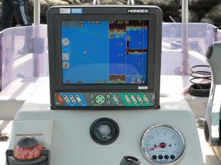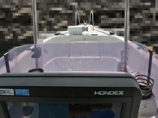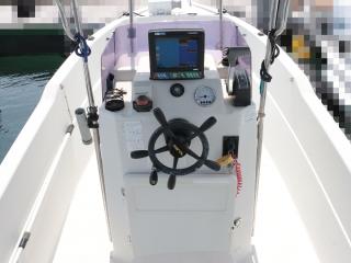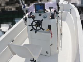 ◆センターコンソール操船部からの見切りは全方位において良く、操船はし易いと思われます。なお、操船部にはホンデックス製8.4インチGPSプロッター魚探が装備されています。なお、このGPS魚探は保管時に簡単に取り外しが可能で、接続する線の取り出し穴もキチンと蓋ができるようになっていますので、コンソール内への入水対策もしっかりされています。