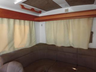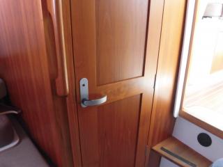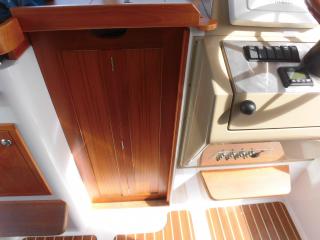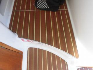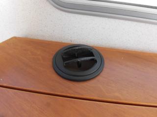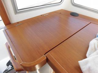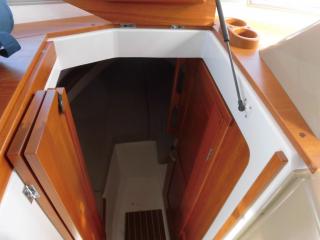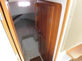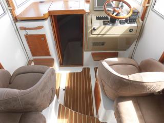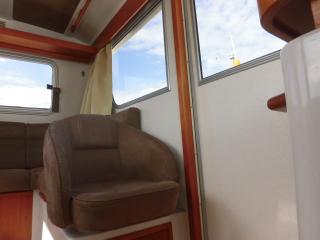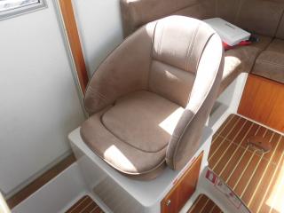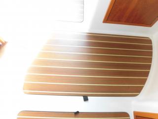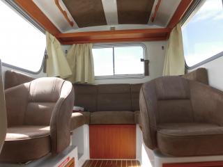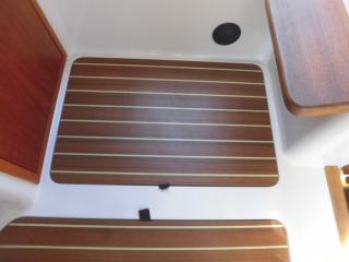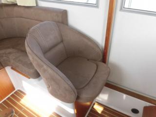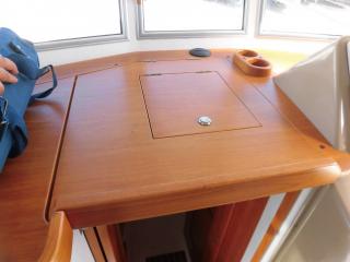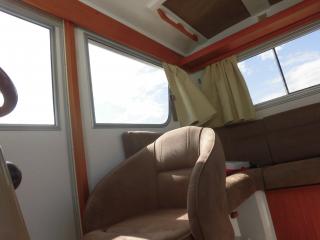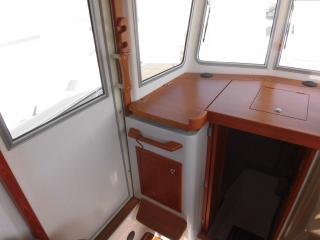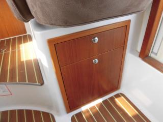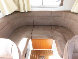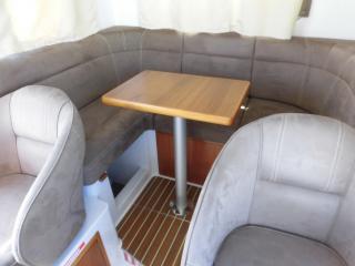 キャビン内は25ftとは思えないほど広く後部にはテーブルを囲うようにコの字型の3人掛けのソファーが有り前方には単独のキャプテンシートとナビシートが有り、各シートはスエード生地で統一されておりチーク材もふんだんに使われいるのでシックな感じが北欧艇を感じます。